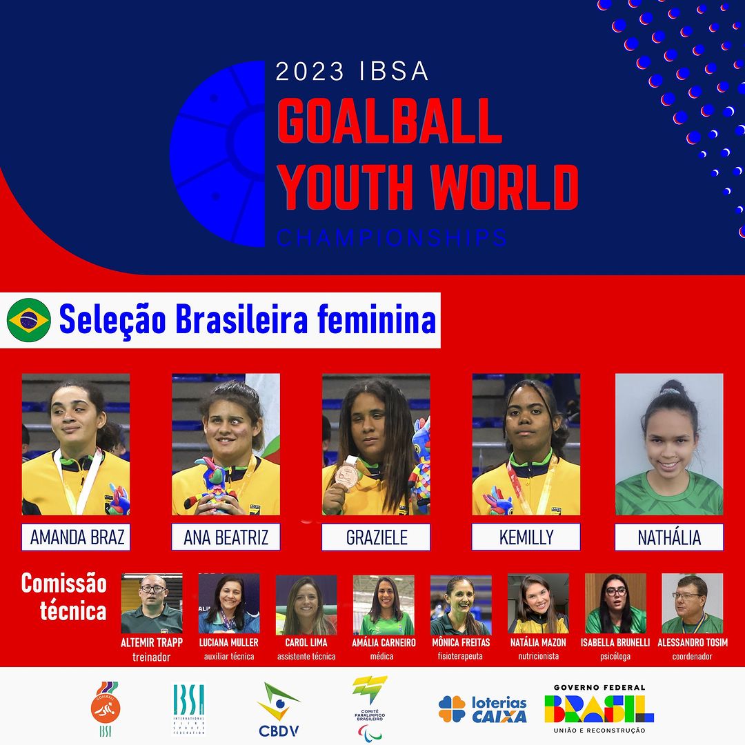 #PraCegoVer: dois cards têm o fundo vermelho com um rodapé em branco com as logos da IBSA, CBDV, CPB, Loterias Caixa e governo federal. No topo, um fundo em azul escuro com a logo do Mundial centralizada (a metade de uma bola azul ao lado do nome do evento em inglês – 2023 IBSA Goalball Youth World Championships). No centro do primeiro card, as fotos das cinco atletas convocadas com seus nomes embaixo das fotos: Amanda Braz, Ana Beatriz, Graziele, Kemilly e Nathália. Abaixo delas, as fotos de oito membros da comissão técnica com seus nomes: Altemir Trapp (treinador), Luciana Muller (auxiliar técnica), Carol Lima (assistente técnica), Amália Carneiro (médica), Mônica Freitas (fisioterapeuta), Natália Mazon (nutricionista), Isabella Brunelli (psicóloga) e Alessandro Tosim (coordenador). O segundo card traz seis fotos dos convocados com os respectivos nomes: André Luiz, Bryan, Fabio Junior, Marco Antonio, Victor Hugo e Wellington. Na parte da comissão técnica, Rene Oliveira (treinador), Eraldo Santos (auxiliar técnico) e cinco membros que se repetem do card anterior: Amália, Mônica, Natália, Isabella e Alessandro.